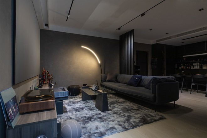 改变客厅走向,摆脱沙发靠墙布置局限,沙发靠背成为划分玄关与客厅的“软隔断”。以投影仪代替电视,收放自如的幕布,打造出简约多变的多功能客厅。