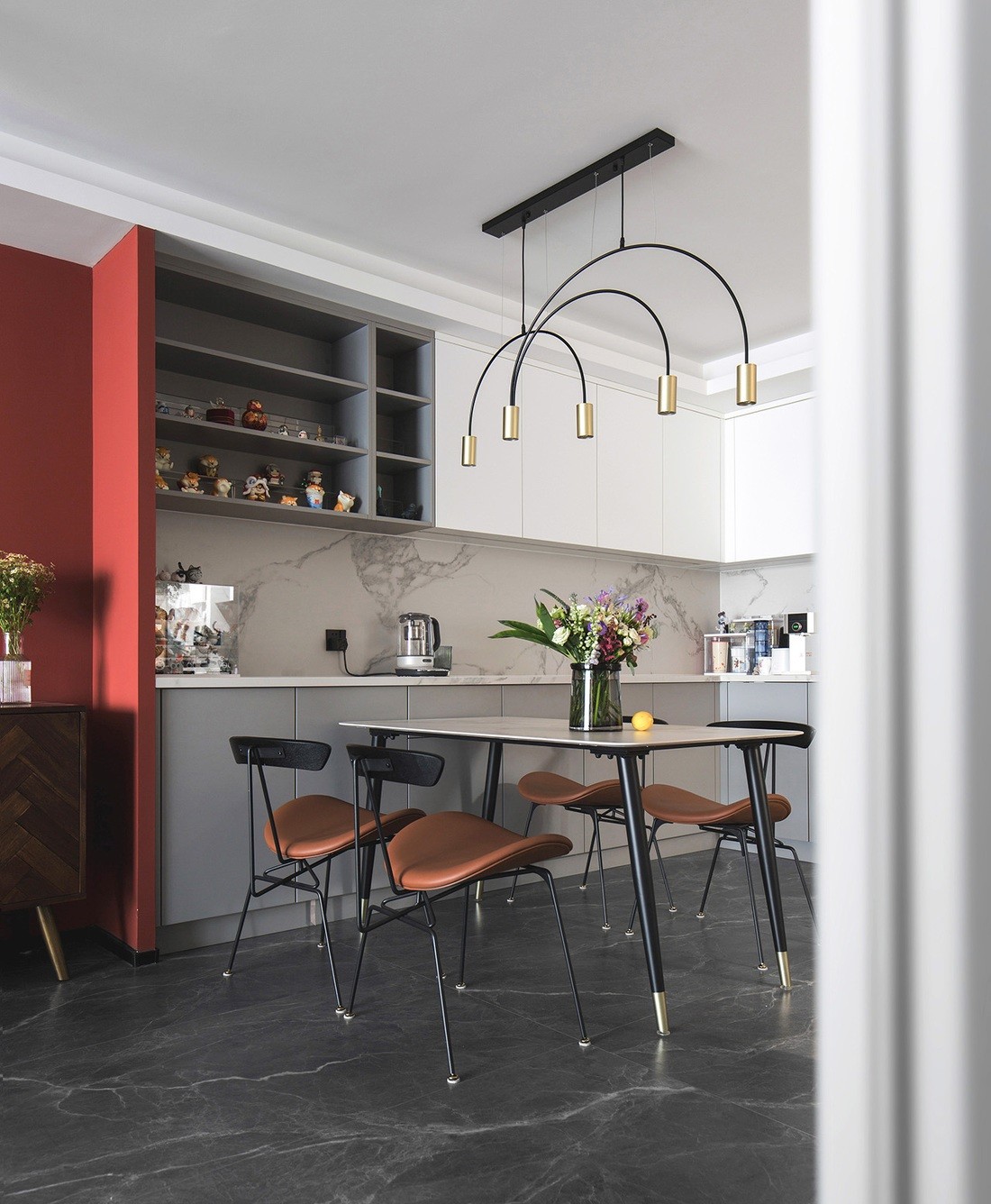 门厅过后来到由餐边柜围合而成的餐厅区域。这种中西厨分离的布局样式,非常适合增进一家人的感情。