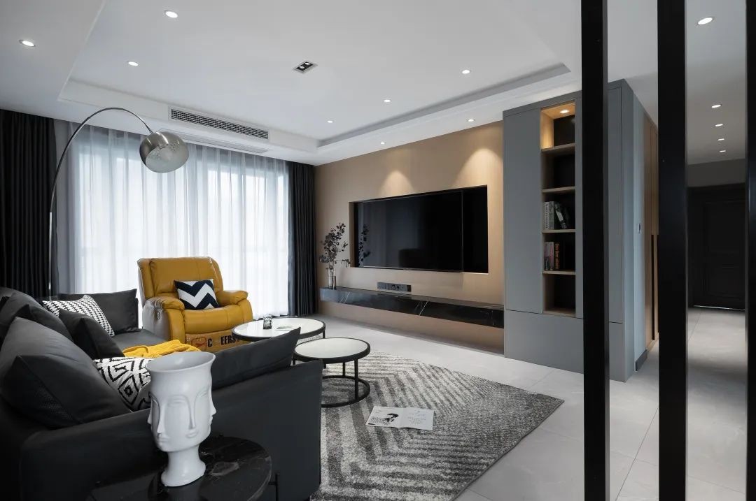 客厅现代风的基础,天花采取无主灯的吊平顶设计,灰色沙发墙与布艺沙发、地毯等软装,电视墙这是木质感定制的设计,加入黄色皮沙发椅与毯子,带来一种简约而又有活力的空间气息。