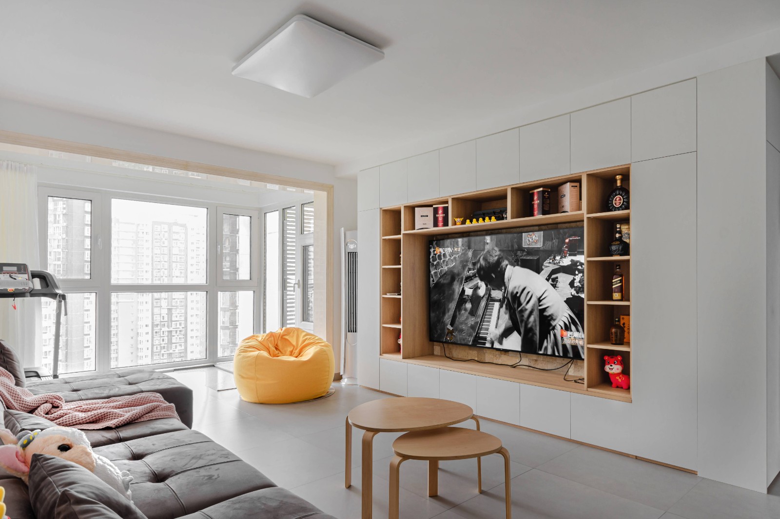 完成方案的客厅舍弃了满墙壁纸和不实用的吊顶,利用电视背景墙的位置做了满墙的储物柜,白色柜门配上灰色柔光砖仍跟白墙相呼应。