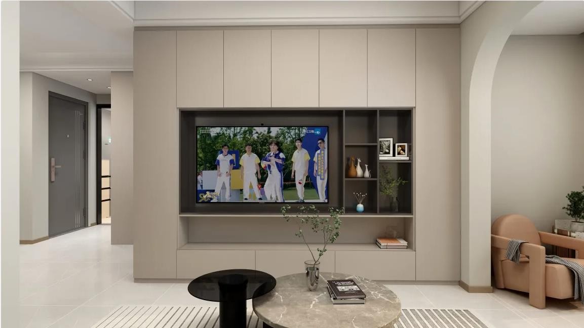 客厅设计采用奶油色系,整体采用了无主灯设计,现代简约