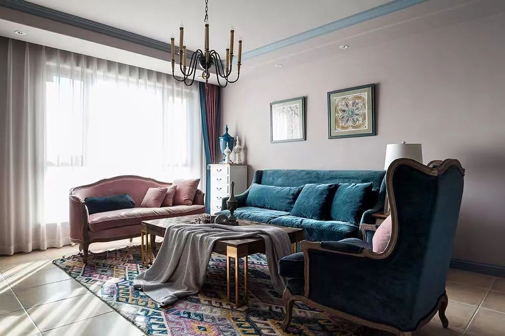 客厅在暗粉色的墙面基础,搭配上一套雀蓝色+粉色的布艺沙发