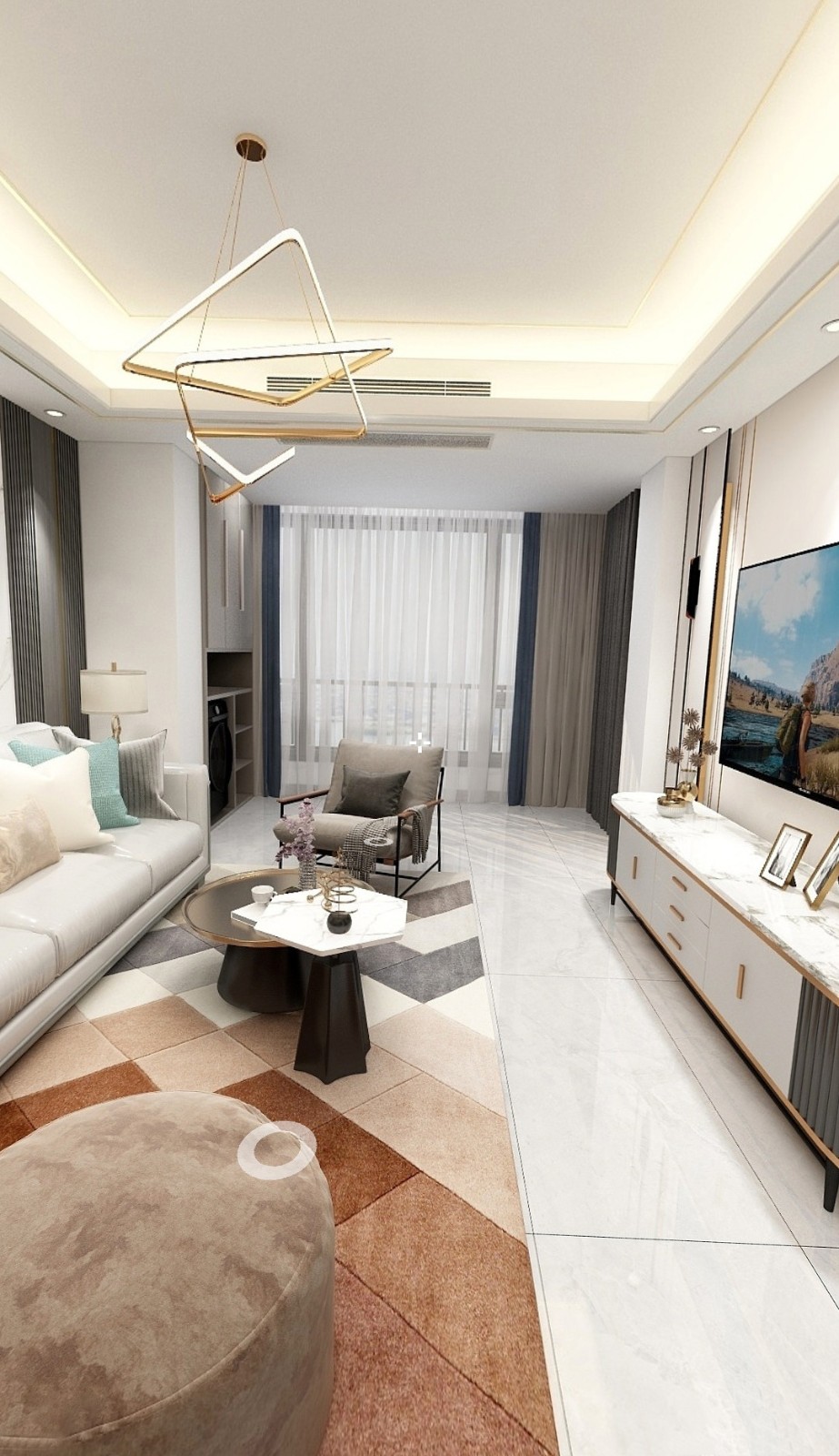 入门处左边一排的柜子,分别为鞋柜、酒柜、装饰柜、电视柜。解决业主的收纳问题,也让空间显得大一下。面对过道处的柜子是装饰柜,用格栅和一个简单的柜子加上一些特别的摆件,让过道处显得不会那么单调的。沙发背景墙用栅格、木饰面、硬包结合而成,采用的颜色都是现代流行色。主卧的背景墙是用了硬包加木饰面,显得比较大气点,又不会太单调了。
