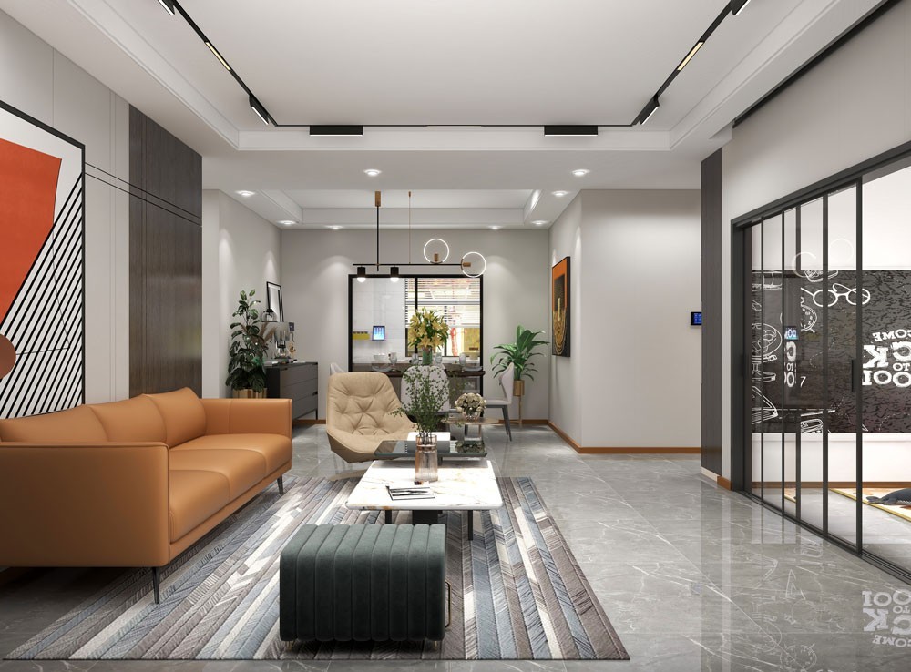 有质感的暖灰色以及沉稳的深咖啡色调中跳脱橙色,多元化元素在空间中既对立又统一,是一种透露着对高品质生活的理解与尊重的设计格调。