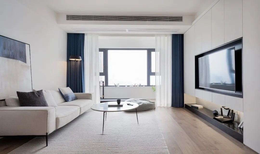 客厅去掉单椅去掉阳台门,去掉一切不必要的装饰,让小朋友可以在这个空间无阻碍的玩耍,地面通铺木质地板蓝白色系窗帘及舒适的米色布艺沙发,圆形的大理石面的茶几遇上柔软的地毯和舒适有度的懒人沙发随性而又惬意