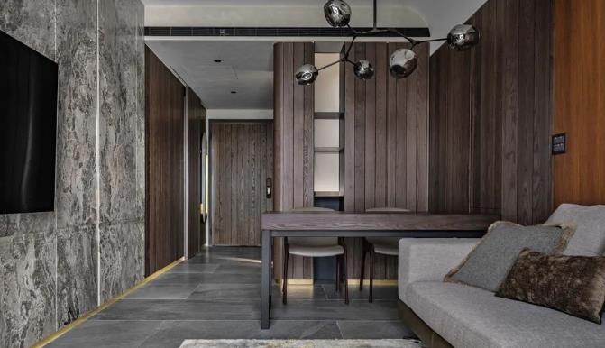 延续入门廊道的染色木皮立面,刻意流露悬浮感,下方予金色发丝纹发木板,贯穿整个空间为框,透过线条沿壁流动,即便与电视背景墙相对的木皮立面,在暗色光晕的流动变幻之下,依然塑造出异立面叠加的一致性。