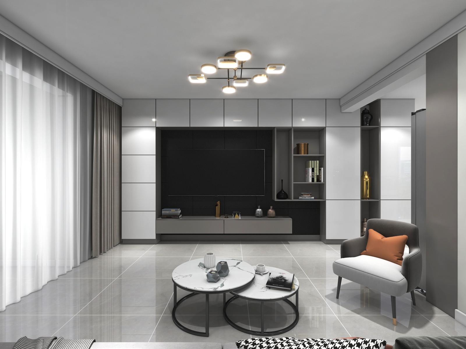 电视墙设计很多储物柜,即可满足储物空间。
