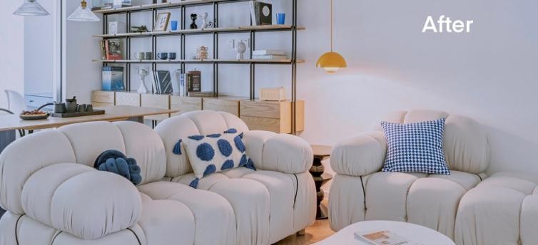 软装搭配的格调在乎细节,客厅一角的圆型小茶几上方的橘色小吊灯,就是这个特别出彩的细节