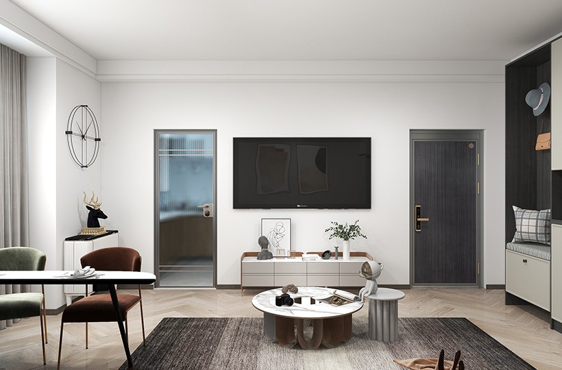 餐厅空间与客厅是一体的没有明显的分区,使空间通透带来视觉效果上的冲击。厨房用的是金属门简单通透,跟入户门形成对称,让电视墙显得更为整体,使整个空间统一增加美观度。