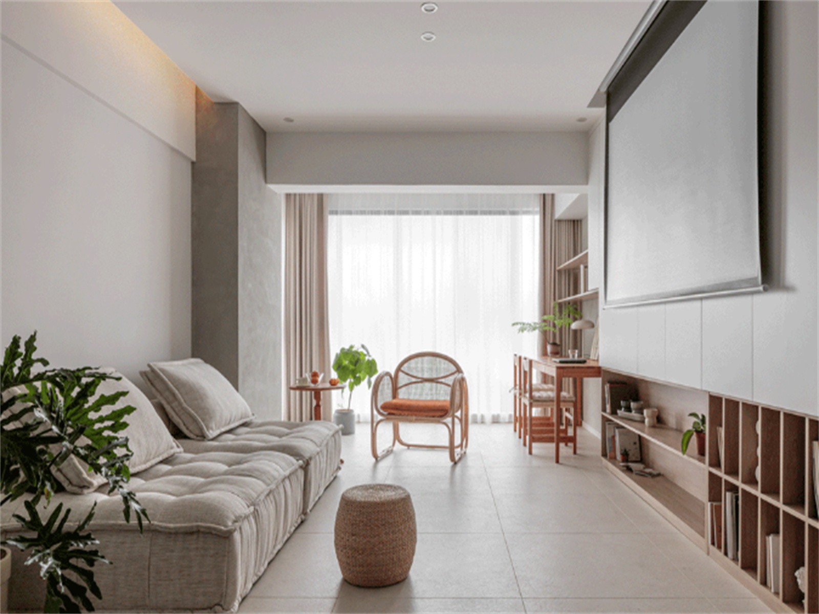 客厅,哑光砖地面搭配无主灯设计,整墙收纳柜做背景,下方开放式设计可当书架,隐藏式幕布提供观影功能