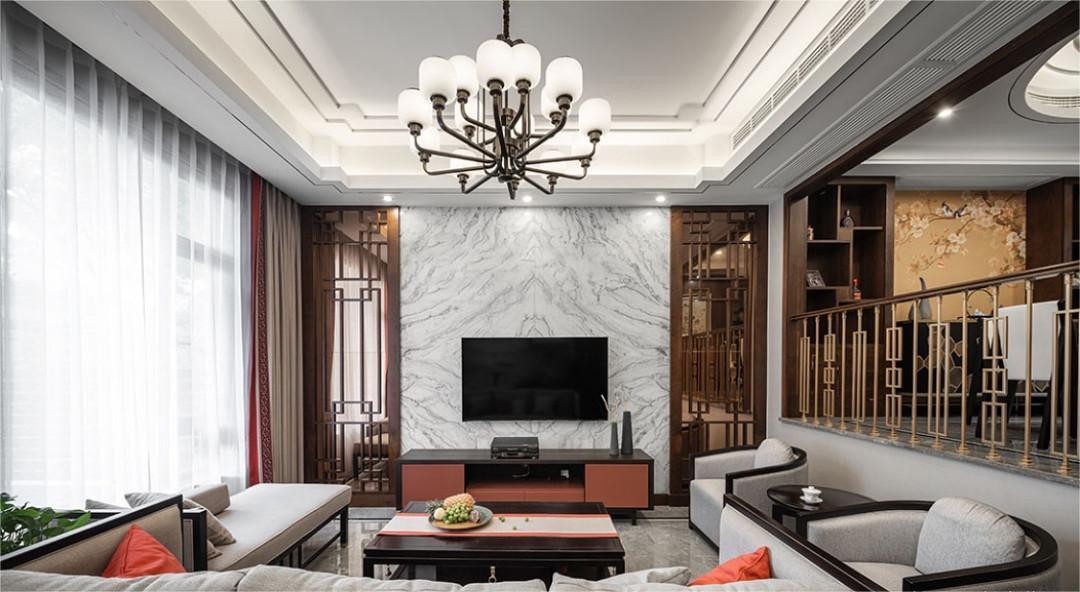 墙面用金属和木质镂空营造东方雅奢的质感,客厅与餐厅间的栏杆的材质也是选择的金属,与电视背景墙边的金属拼接部分相映称