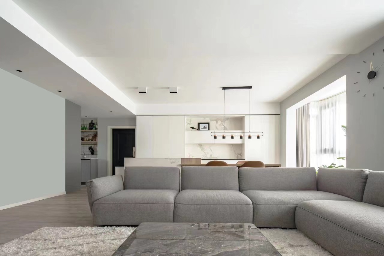 进门开阔视角,客餐厅为开敞式交互空间,吊顶不做多层次造型,显出楼高,整体平整简洁,大方利落;