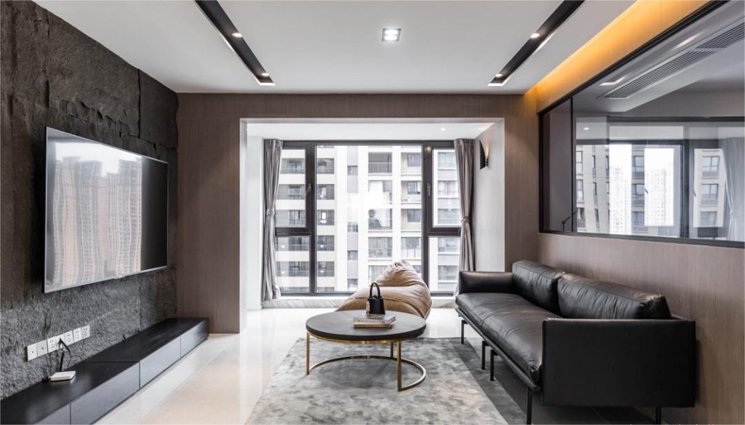 无主灯的设计***上保留了空间的原有高度,也让整个空间更加干净整洁。沙发背景暗藏柔光灯带,暖黄的灯光中和了黑色的厉冷,构建了一个温馨饱满的生活环境。
