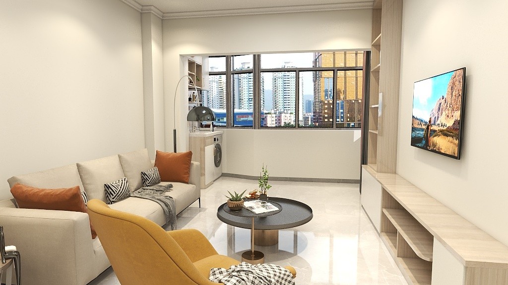 客厅通铺阳台,阳台封窗。靠墙一面做洗衣机柜,增加收纳和使用率