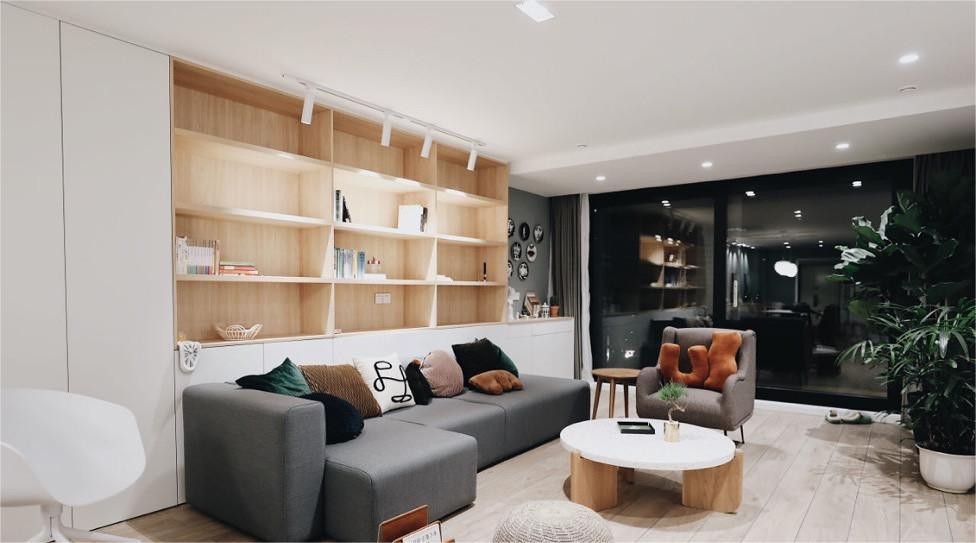 将与客厅相连的空间打通,做了开放式的设计,让整个公共空间连成一片。客厅以实木定制书架作为沙发背景墙,极具个性。开放式的书架让储物拿取便捷,空间上也更显家居层次感。模块式组合沙发摆放更加灵活,各自忙自己的事时,可以根据自己的使用习惯调整,氛围轻松。