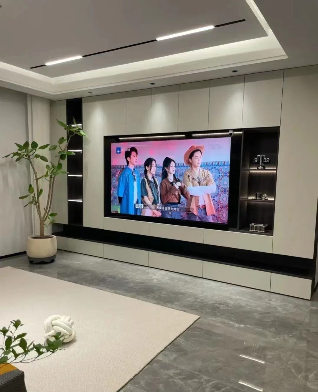 客厅顶面为现在流行的无主灯设计,以及电视墙为整墙电视柜,空间很饱满