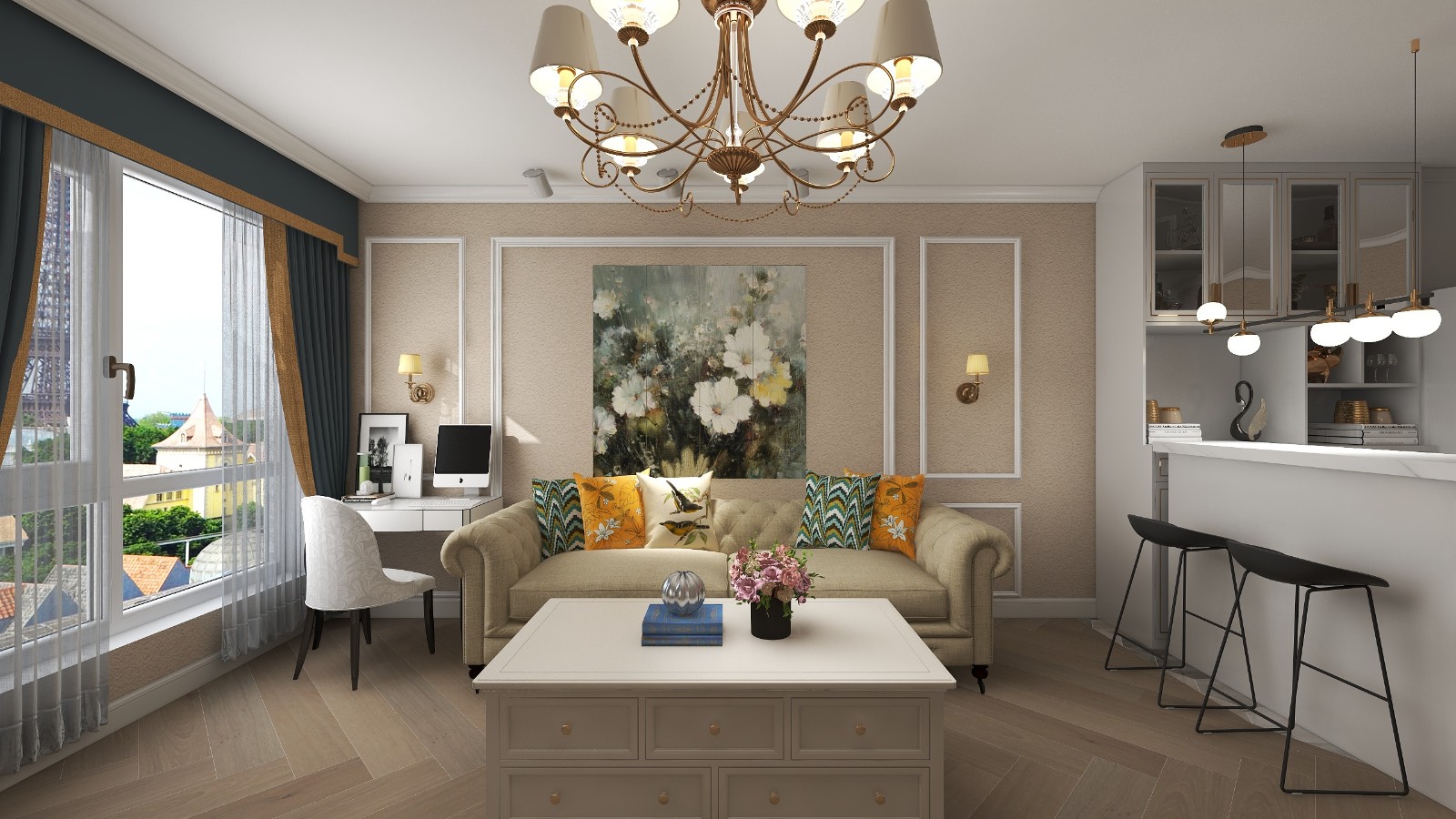 客户想要在客厅当中设置一个吧台,我们将其运用当做客厅和餐厅的一个分界线。延伸出来的吧台搭配高脚椅子和折射台面的吊灯。吧台旁巨大的柜子,不论是存放好酒方便坐在吧台细细品尝,还是摆放艺术品都是完美的选择。柜子和厨房之间可空出存放冰箱,让冰箱和厨房的联系更加紧密。