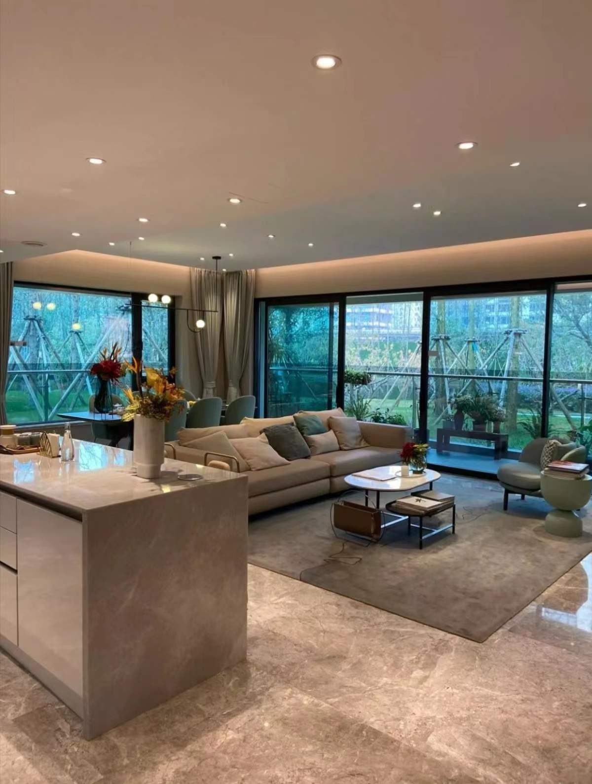 整个风格以现代简约为主,无主灯的大客厅,简约精致