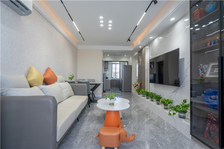 设计师更改了入户方向,将墙体封死设计成电视背景墙,大理石与软包拼接设计,白、灰、黄三色块碰撞,营造视觉的冲击力,层次分明,质感超然;