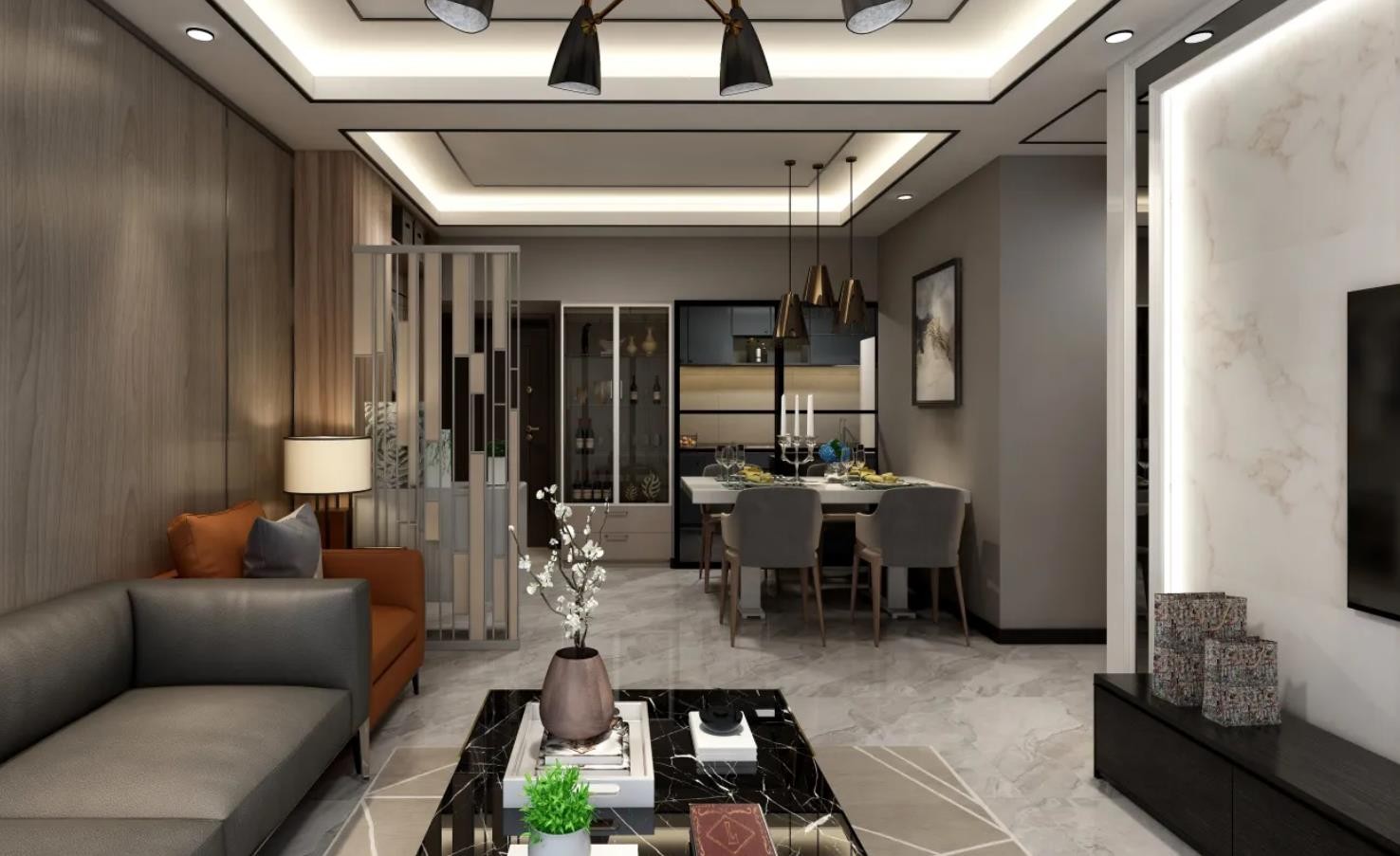 整个设计在沉静的色调里将现代都市的时尚与轻奢演绎,讲究流畅的线条,崇尚简约而不失时尚的设计理念。通过灯光和材料的对比将重点 放在室内,一切都 非常简洁且易于使用,但同时在空间软装装饰更加精致。