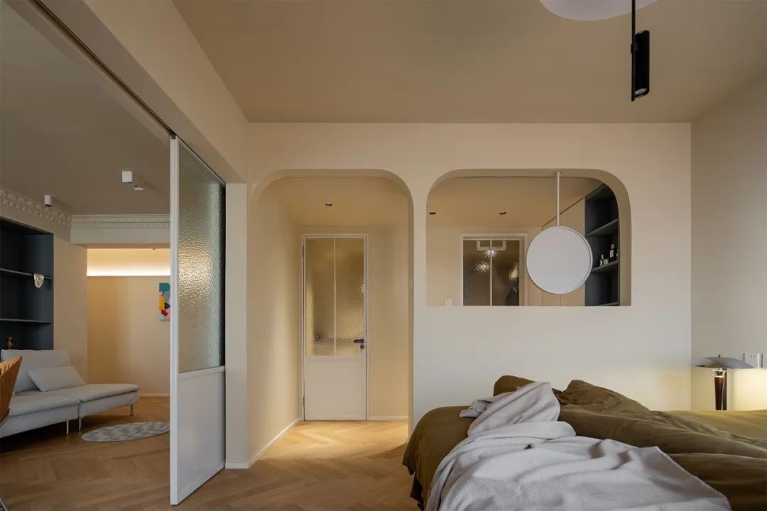 主卫+主卧设计成酒店套间的形式,主卧与半开放式卫生间贯通,双拱形洞口设计让空间层次更加丰富,也更有通透感和趣味性。卫浴区的白色不锈钢门套搭配玻璃,同样是水波纹的材质,透光不透人,有种朦胧美。