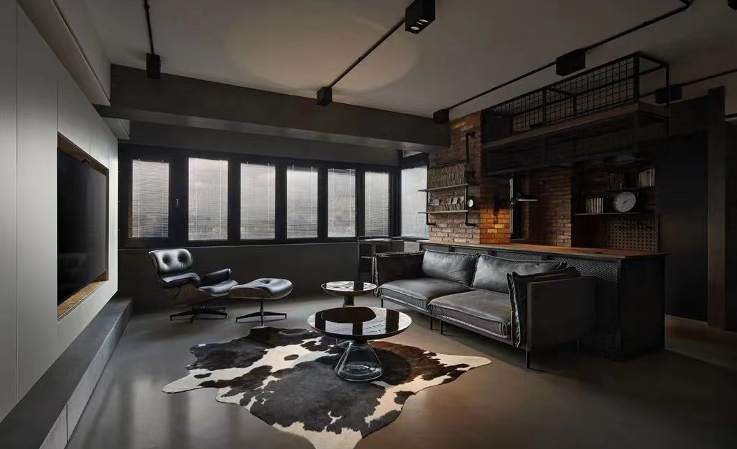 工业风与现代风混合,既不完全复古,又不落后潮流。明装的灯管、红砖与微水泥碰撞,新旧材质碰撞出新的火花,各有特色又协调。奶牛地毯的加入,是这酷黑的空间里的反差萌。