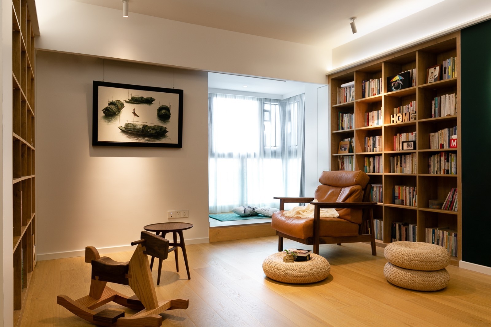 在家居精细化的变化中,就提到了客厅沙发电视变多元起居。就如该案例一样,客厅无沙发电视背景墙设计,取代的是两面顶天立地的书柜,要说为什么是书柜,因为爱学习的一家人,平常都喜欢看书。