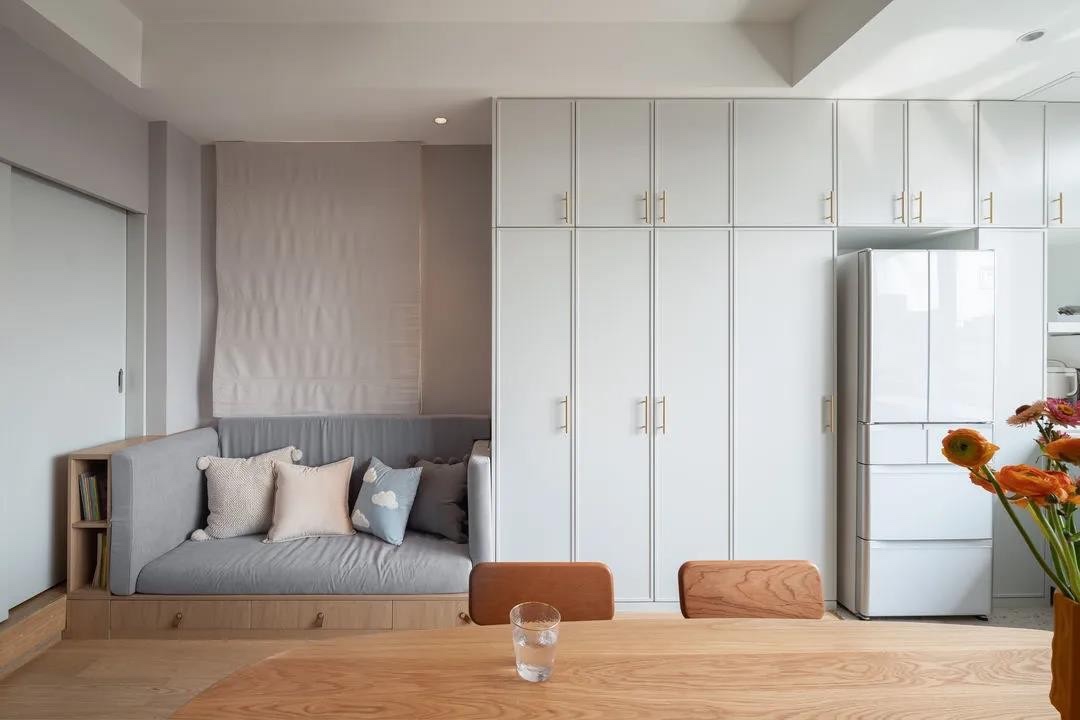 小户型的空间放大,原来并不是“痴人说梦”。 看了主空间的整体效果,我被这亲切治愈的氛围深深迷住了,家的感觉如此浓烈。 在设计处理上,设计师用了“模糊界限、降低定义”的手法。设置了“去客厅化”,模糊了客厅、餐厅、书房的独立概念,在小户型当中实现了三者合一。