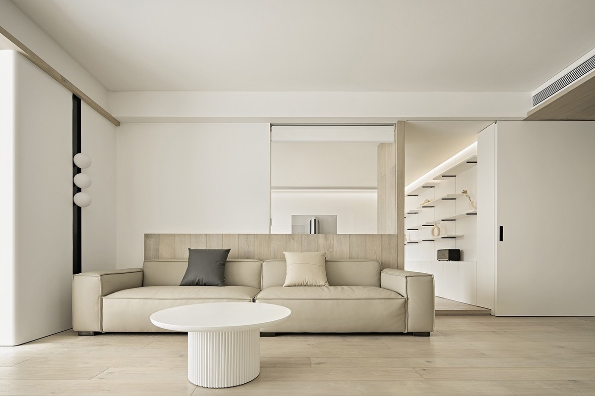 一切设计以光为灵魂,打通南向阳台,以白色为底,浅米色为晕,营造通透明亮的客厅环境。 透明玻璃作为客厅与书房的隔断,形成功能空间之间的联系对话,光线得以从四面八方流入。