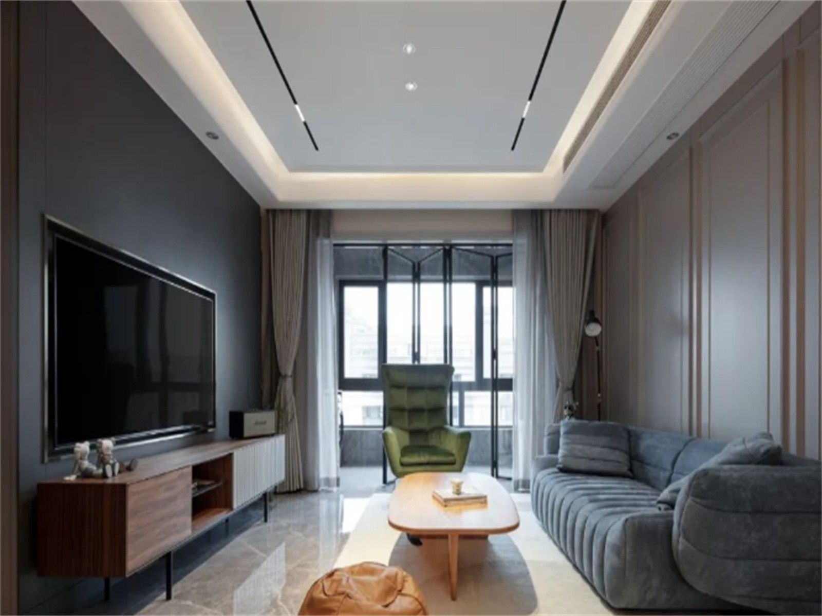 客厅无主灯顶面设计磁吸灯、筒灯与灯带,为空间提供多层次照明,与阳台之间采用吊轨玻璃折叠门隔断,更显通透明亮,同时便于打扫卫生