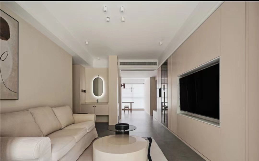 整个设计以奶油米白色调为主,客厅不是很大,收纳空间比较多一些。能做内嵌柜子都做内嵌设计,让整个空间一体化。