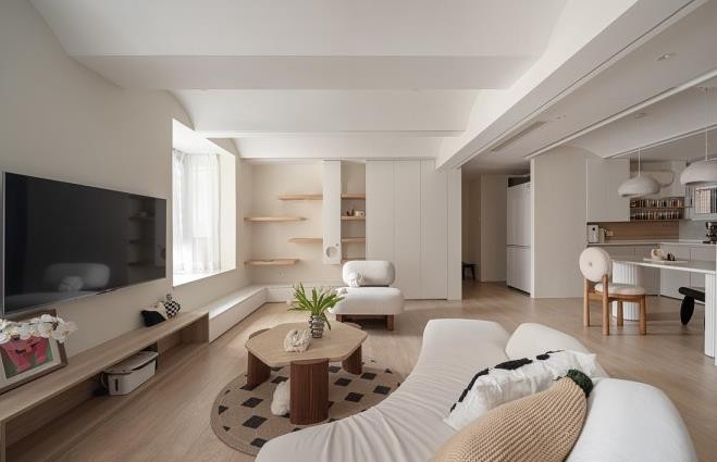 客厅的功能家具面向窗户布置,圆润的形体围合无边界的休闲活动区。考虑窗台比较高增加一圈地台可收纳可坐,高中低不同高度的收纳设计贴合使用者不同的的拿取和整理习惯