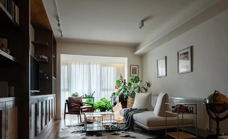客厅改造成落地窗,连通了阳台与客厅,使得客厅更加开阔。电视背景墙采用藤编书柜与木质展示柜一体化,也让客厅的质感提升不少,并满足了屋主可以放置书籍,和展示积木手办。