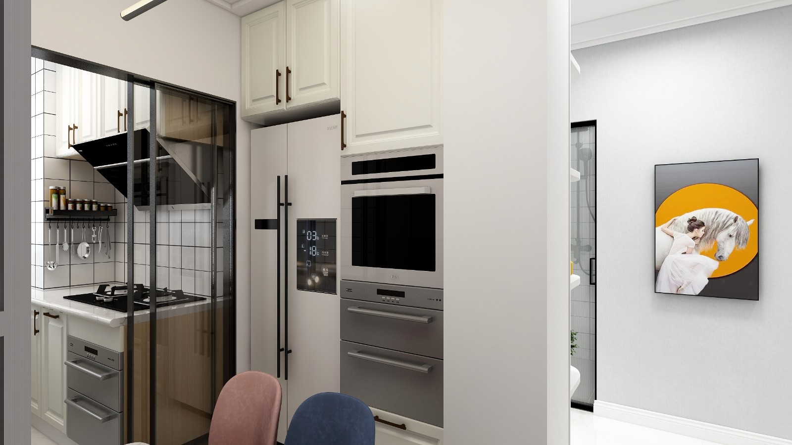 通过灰、白色两个块面之间形成厨房的简约构成,尤其注重功能性,所有电器都可被收纳到橱柜中,节约了空间,显得更为整洁使用。
