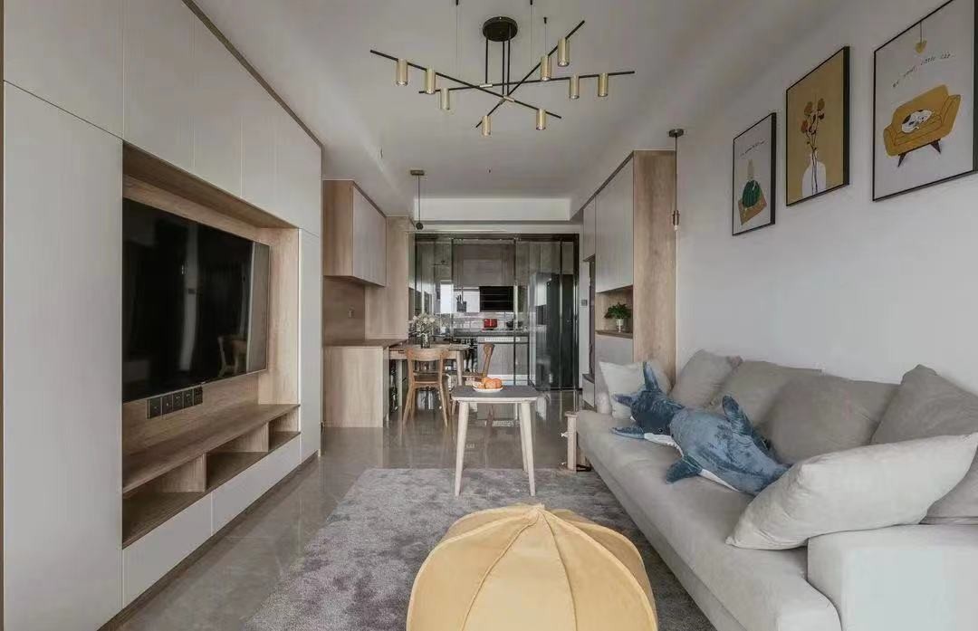 取消传统电视墙设计,直接整面墙打柜子,原木色与白色交替。