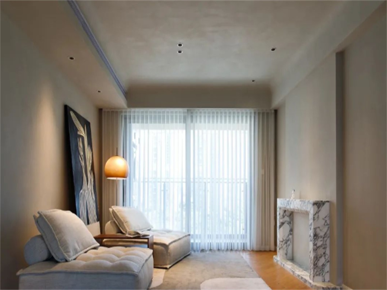 客厅,开放的构架设计整个空间,色彩上以素雅的艺术漆为基底,结合胡桃木家具和人字拼木地板,暖色的灯光设计,将空间氛围与能效结合