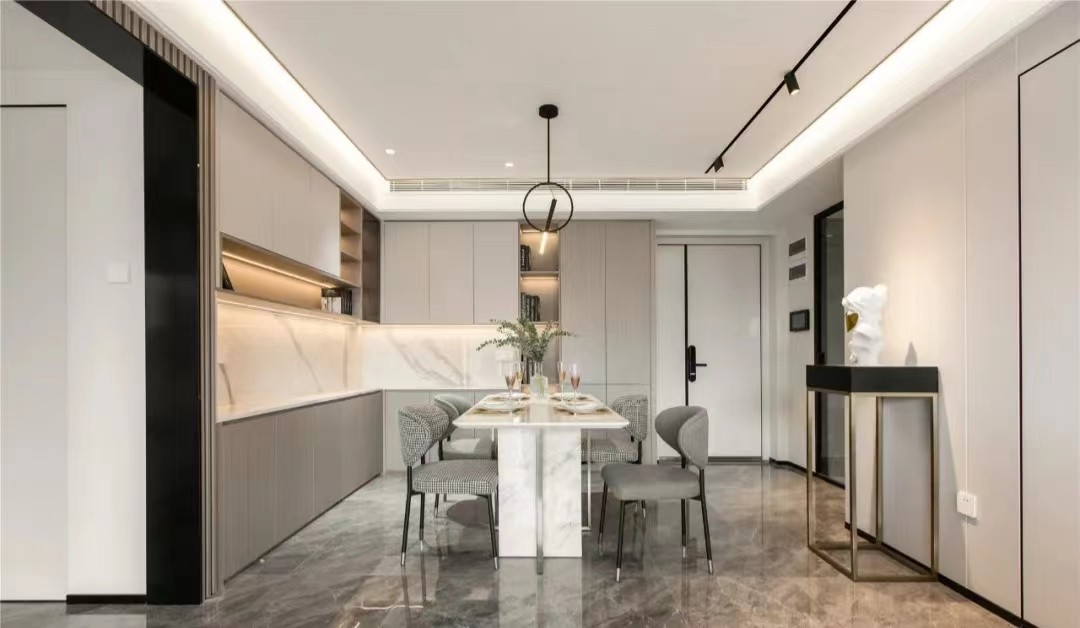 餐厅的餐桌选材以大理石为主,***就是质地较好,纹路大气。搭配上浅灰色平板柜门的酒柜衬托整个空间给人一种比较宁静 协调的效果。
