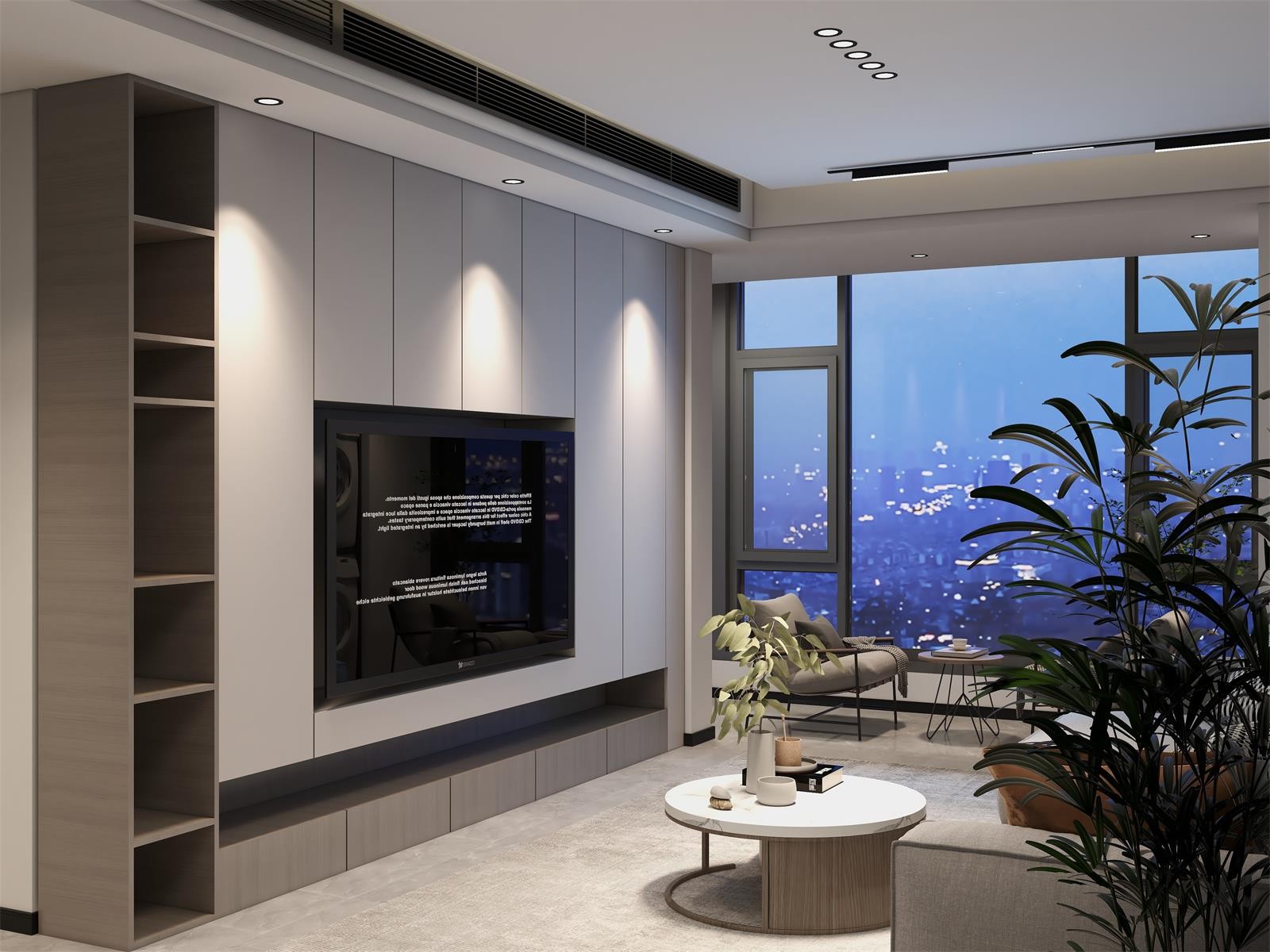 电视墙通过柜子造型的方式,让空间显得不那么单调。同时中央空调做了侧出侧回的加长风口,让顶面连贯性更强烈。