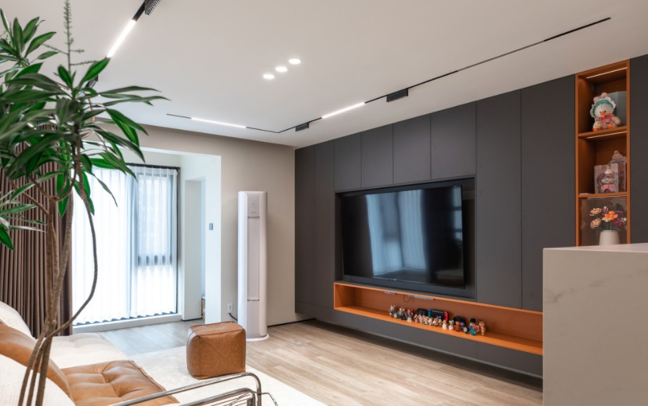 L型爱马仕橘开放格,破开整柜的压抑之余,也增加了电视柜的展示空间,屋主珍藏的手办,也有了栖身之所。