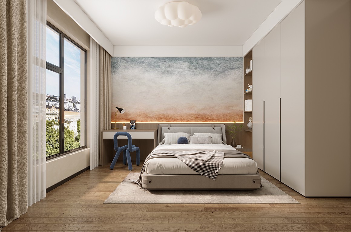 主卧是整套房子中最私密的空间,延用了暖色调搭配整个软装,床头的不同灯光配置增加层次感。软装家具的衣柜、床头柜等设计大方简洁,线条流畅,富有时尚气息,充分体现了自然、闲适、时尚的新生活理念,带给人内心的清静。