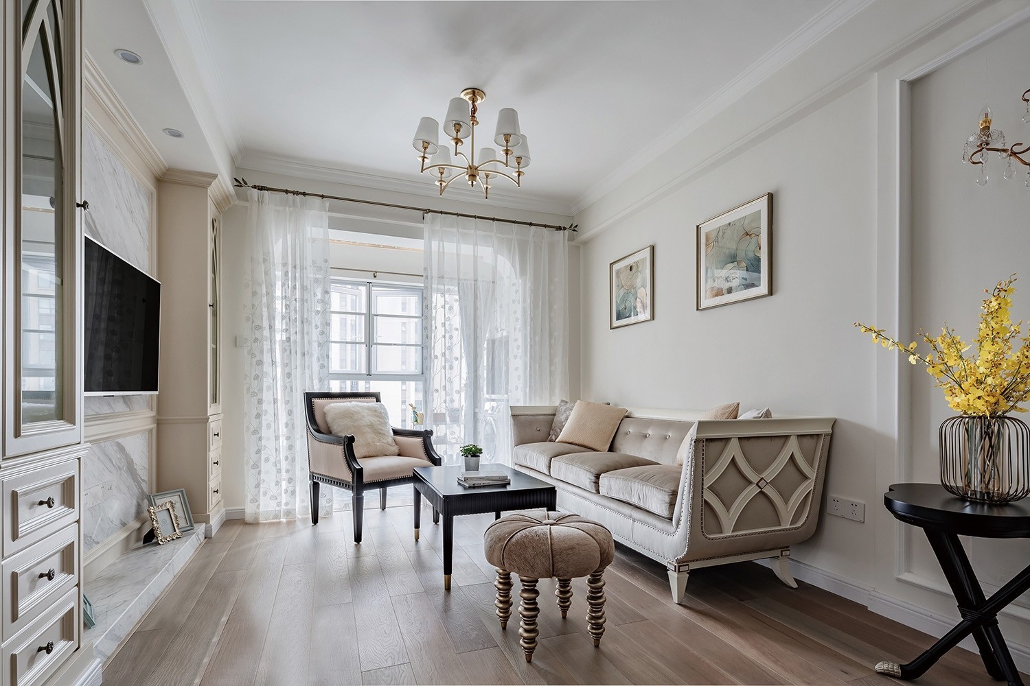 客餐厅整体采用奶白色为整个空间的主调,和原木色系的木地板相呼应,更加贴近自然。家具部分用以重色调点缀空间