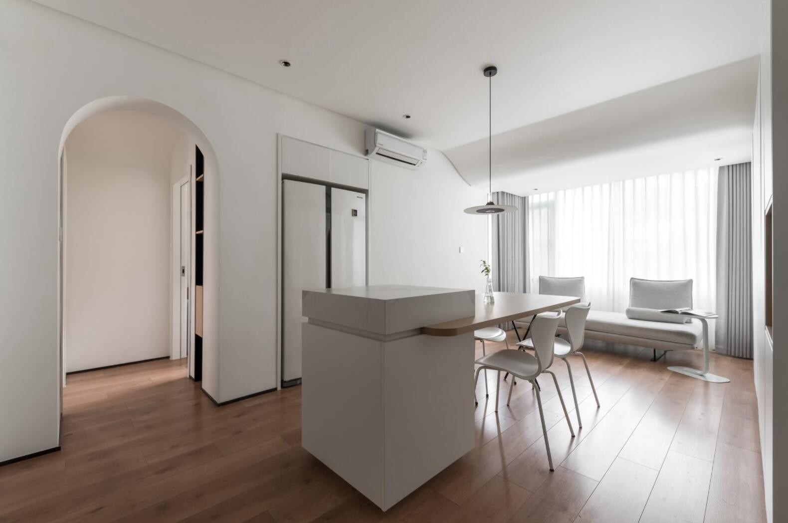 白色的墙壁,温暖的木地板,拱形的门,大理石岛台,不仅一进门就营造出清爽干净的基调,在提升视觉明度的同时又增添了几分几何趣味。 尤其是重新设计后的主卧室和儿童房的移动,为家庭提供了更多的可扩展性。