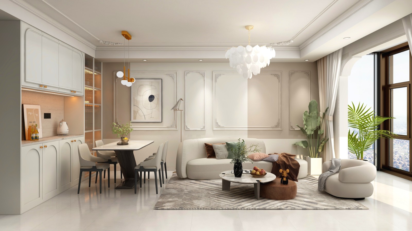 客厅拆除原硬装的阳台移门做拱形门洞设计,将独立阳台改造后纳入客厅,拉伸整体纵深感,打造出家的静谧和深邃之感;