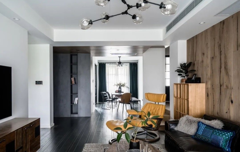 整个客厅宽敞、透亮,使用大面积深色元素覆盖,局部使用亮色点缀,搭配具有年代感的复古家具,为业主营造出乡村民宿风格的家