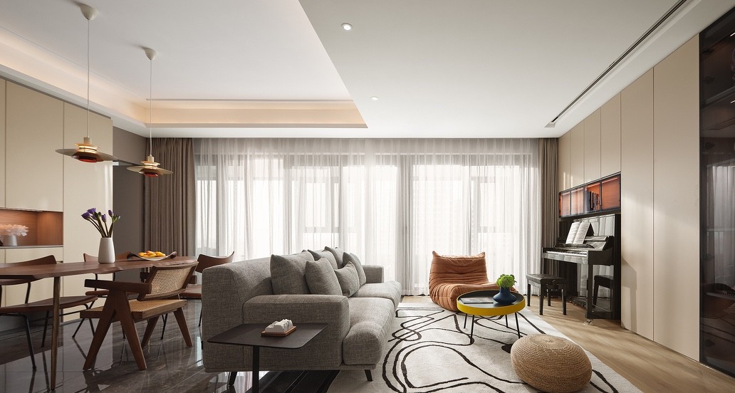 客厅拥有良好的采光,日照充足,光影随着空间中的不同时刻有深有浅的变化着,有时慵懒柔缓,有时跳跃活泼,伴随着悠扬的钢琴声,编织出轻柔优雅的生活情调。