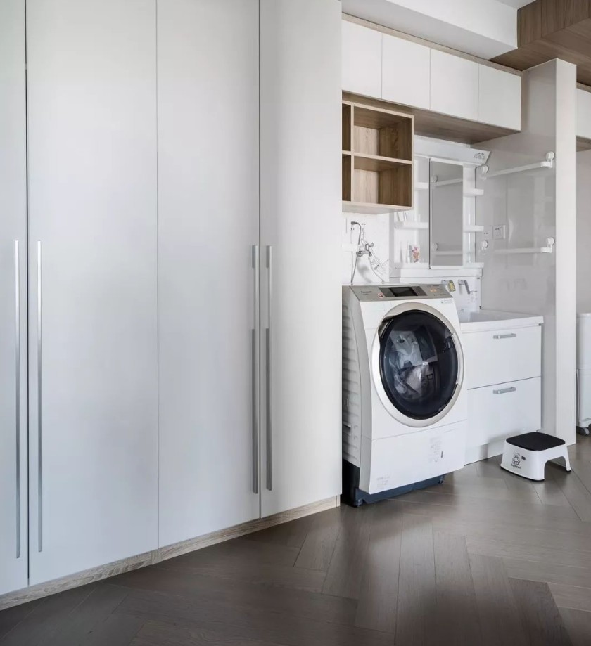 洗衣功能区与卫生洗漱区结合设计,顶部多余空间做一排吊柜,总体占用不到2平米,却非常具有生活实用性