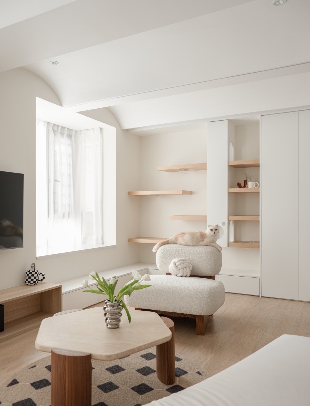 完善的收纳系统释放了萌宠们的活动乐园,由加厚层板太空舱猫洞搭建了猫爬架。即使后期猫咪们玩腻了,也能作展示收纳区,放zz的画和手办或者阿姨的书法作品,也是一处别样的端景。