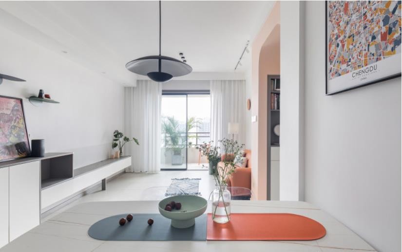 为了室内公区更好采光,窗帘干脆选用白色纱帘。餐桌上方配画为彩版成都地图。客厅则是线条感呆萌的橙色沙发与墨绿色边几搭配。