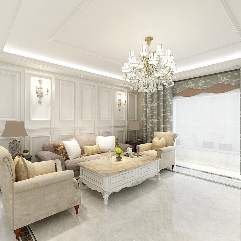 客厅采用***灰的大地砖,做一圈波打线划分区域,与浅雅的护墙板相呼应,低调透露着奢华,又崇尚着自然的宁静