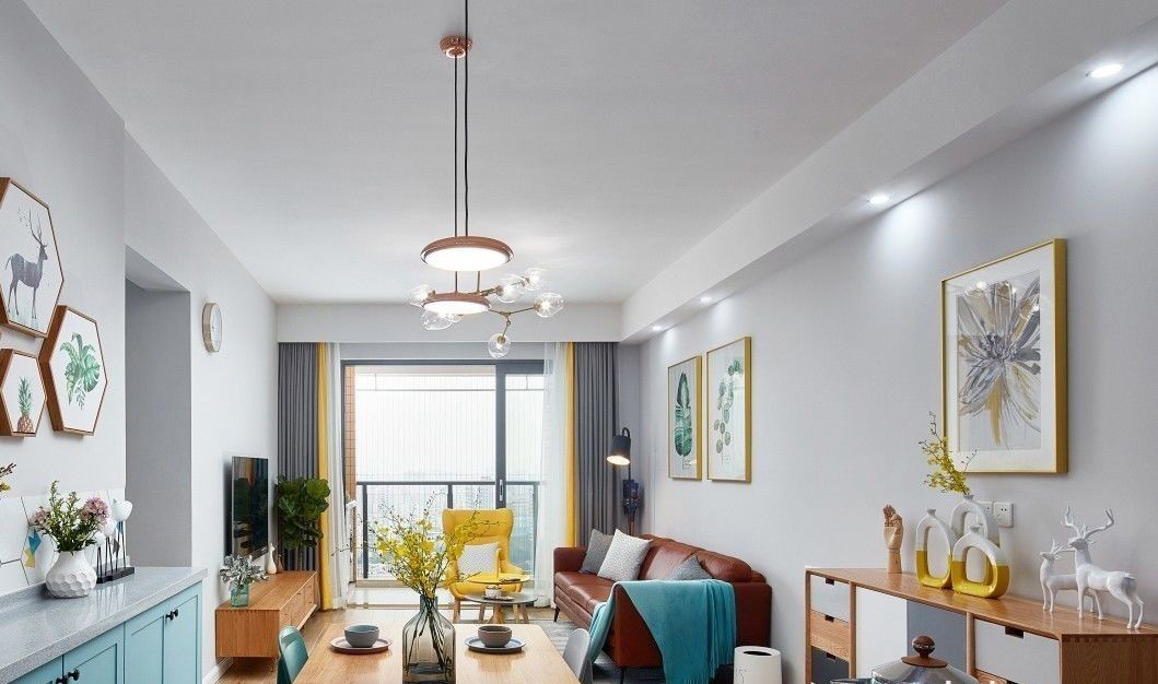 设计师就将这套房子的风格定义为清新北欧,以含蓄柔和的浅灰色作为空间打底色,缀以高饱和度的黄色、绿色与湖蓝色,同时以温润的原木色柔和整体空间视觉感,打造出舒适大气的暖心一宅。